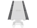 Los dos rieles traseros permiten guardar el posicionador de piernas dividido STERIS u otros accesorios de soporte para las piernas. Otros accesorios pueden fijarse a los rieles interiores o almacenarse en la bandeja/base con contrapeso. (Accesorios no incluidos).